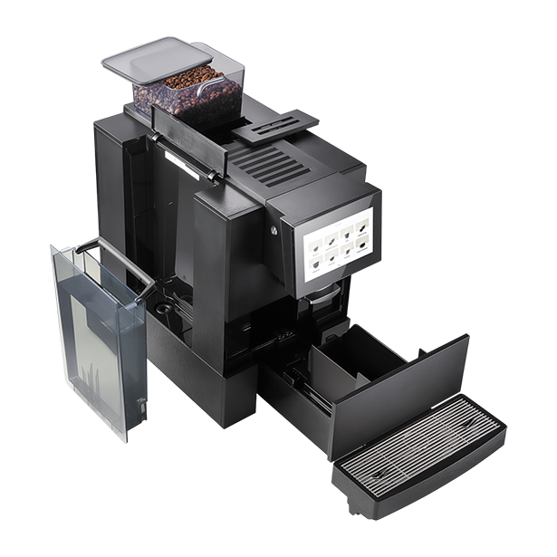Совершенно новый дизайн с вместительным бункером для воды, контейнером для кофейных зёрен и контейнером для кофейных отходов позволяет кофемашине KAFFIT COM E60T работать в течение целого дня без перерывов.