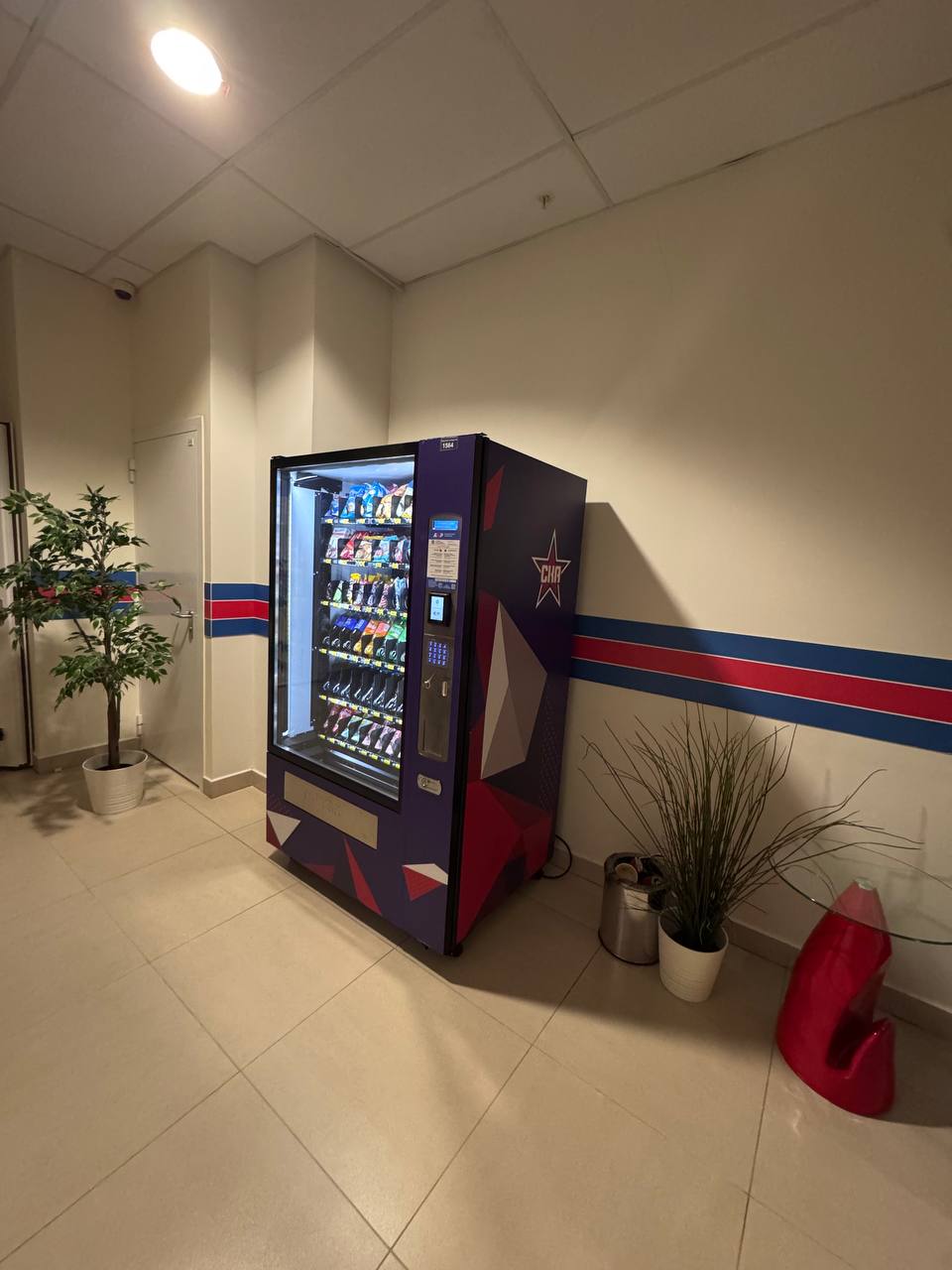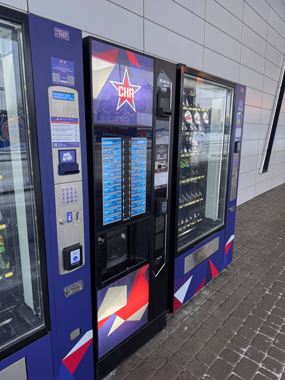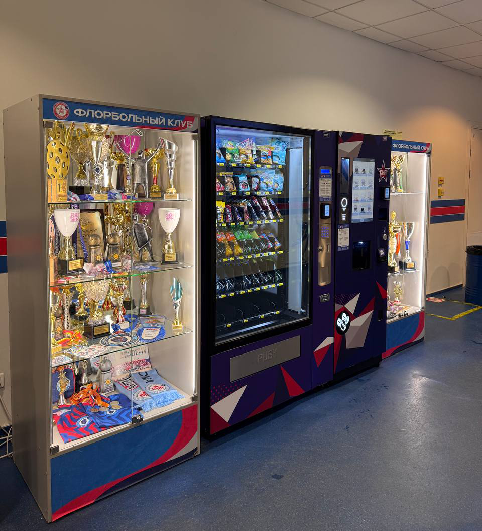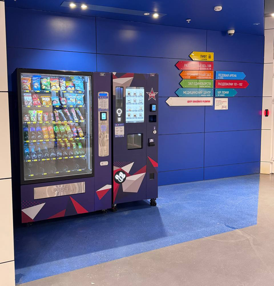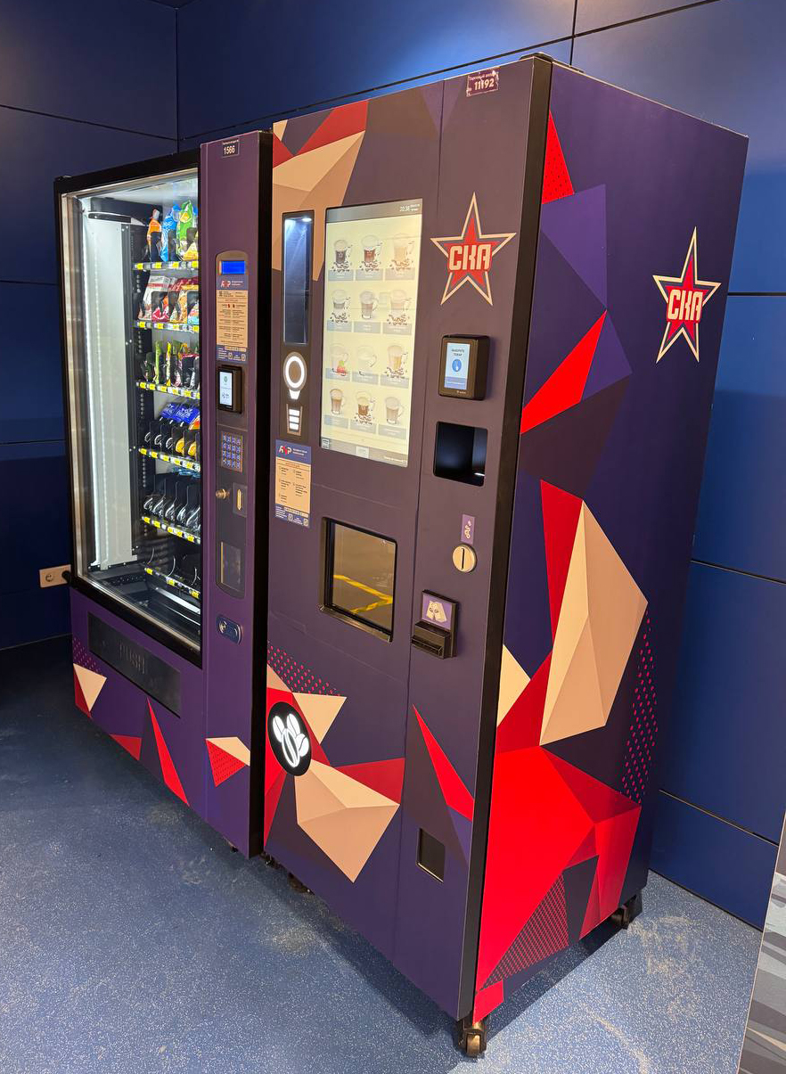 В автоматах доступны горячие напитки, снеки, вода и перекусы, а также официальная атрибутика СКА — значки, шарфы, шайбы и другие сувениры с символикой клуба. Это позволяет быстро перекусить, согреться или приобрести памятный сувенир во время матчей, тренировок и массовых мероприятий.