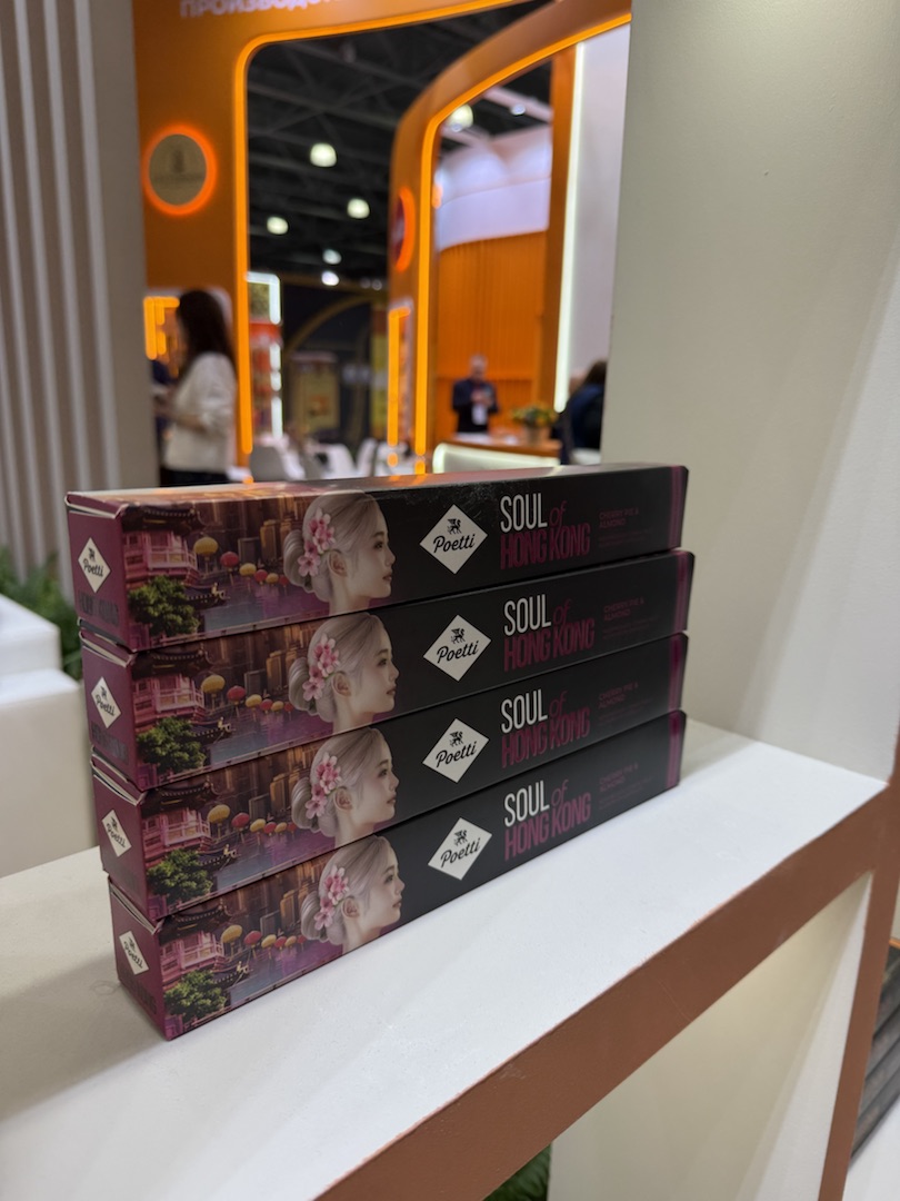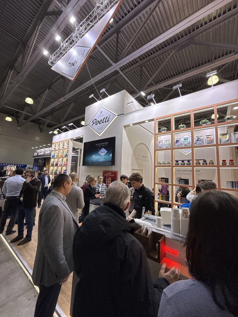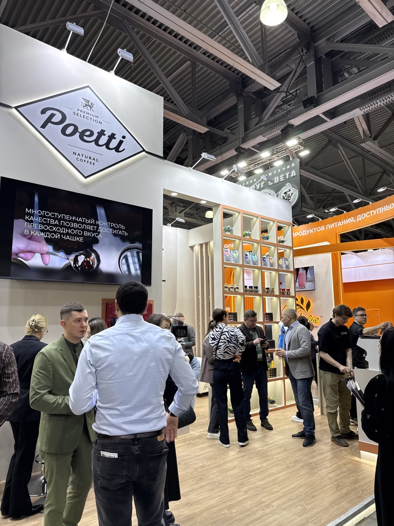 На второй день выставки у стенда Poetti был настоящий ажиотаж: бренд демонстрировал ассортимент кофе, включая молотый, зерновой и капсульный, а также предлагал VR-экскурсию на кофеобжарочный завод в Тверской области и Академию бариста Poetti. Команда Poetti обладает многолетним опытом и предлагает премиальные продукты с неизменно высоким уровнем качества.